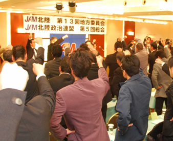 JAM北陸は1月28日、ホテルニューオータニ高岡で第13回地方委員会、第5回政治連盟総会を開催しJAM北陸の2012年春季生活闘争方針、地方選挙の取組みが承認され、単組事情から交代する役員7名の補充が確認された。